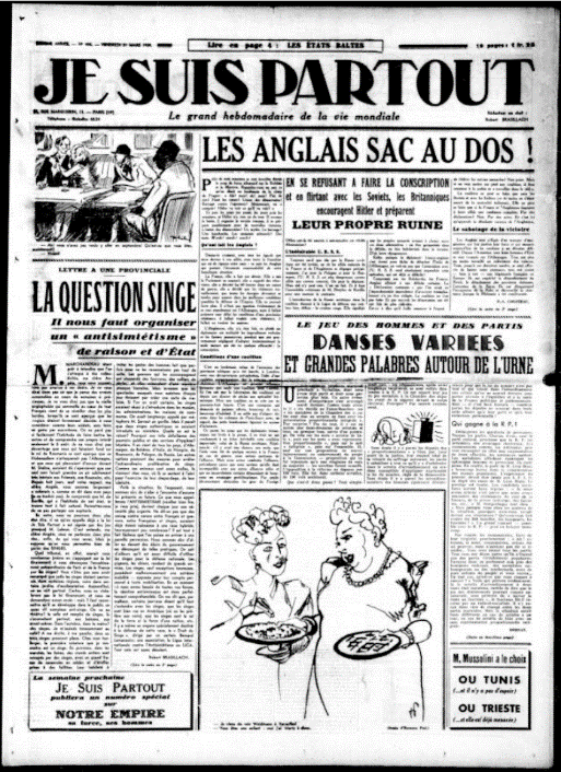 Quickly a ‘rising-star’ in the intellectual community, Brasillach was embarking on a moral mission to rally and unite French society, and to combat threats to national and social cohesion through his writings. With the tangible economic and social instability left in the wake of WWI, France was on the brink of its second major wave of anti-Semitic and fascist thought, second only to the scandalous Dreyfus affair. Brasillach envisaged fascism as the means to achieve France’s national reform, and together with a surge of intellectuals around Europe, he was attracted by the “spiritual revolution” it promised.[ii] He was actively engaged in public discourse to incite this “spiritual revolution” amongst his society, which he believed was threatened by foreign forces gradually infiltrating and corroding French nationality from within. Tucker notes that for Brasillach, rather than being an overtly social, political, or economic “revolution”, fascism constituted a form of self-fulfilment on an individual level and a particularly youth-oriented ideal.[iii] Whilst he engaged with a variety of different written medias as a critic, essayist and novelist, this was primarily through the printed press, with which he was heavily involved for most of his life. He is largely remembered, infamously so, for his contributions to right-wing newspapers, notably the increasingly fascist weekly newspaper, Je suis partout, of which he was editor from 1937-1943. New forms of media coincided with the rise of fascism across the world. At the beginning of his time as editor, the rise of media and new technologies allowed the rest of the world to watch the Spanish Civil War (1936-1939) unfold, with Spain as ‘the mirror to the world’.[iv] As a result, Brasillach was conscious of the power of media to disseminate his ideals. Perhaps one of the most notorious of his writings was an article entitled La question singe, published on the front cover of the paper before the outbreak of WWII in 1939. Schue describes the period during which Brasillach wrote La question singe simply as ‘ideologically charged’.[v]