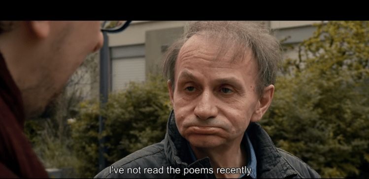 Whoever he is, the public is fascinated with Houellebecq. He is instantly recognisable in Enlèvement due to his parka, blue shirt and the cigarette held between his middle and ring fingers. Before the kidnapping, he encounters an enthusiastic fan who says ‘vouz avez un physique particulier’ [09:30]. Houellebecq, meanwhile, is reluctant, displaying his trademark nonchalant expression, lower lip thrust out: