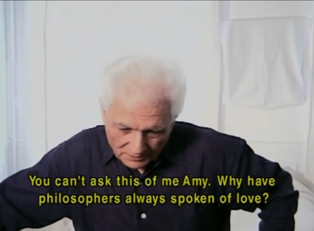 When he finds himself in these interview situations, Derrida often creates tension by refusing to pretend that he is in a dialogue with the audience, and instead highlighting that he is only talking to Ziering Kofman, such as when she asks him to say something on the topic of love. Dissatisfied by her line of questioning on love, with it lacking an actual question, he addresses her directly: “il faut pas me demander ça” [00:36:59]. This direct address to the director makes evident the limitations of the dialogue in the film: Derrida is talking to Ziering Kofman, Ziering Kofman is talking to Derrida, and the viewer is not being spoken to; instead they are engaging in an act of reading. As he says in the previously mentioned 1986 interview with Raymond Williams, “film is a kind of writing”, even when documentaries and interviews try to pretend that they are not.