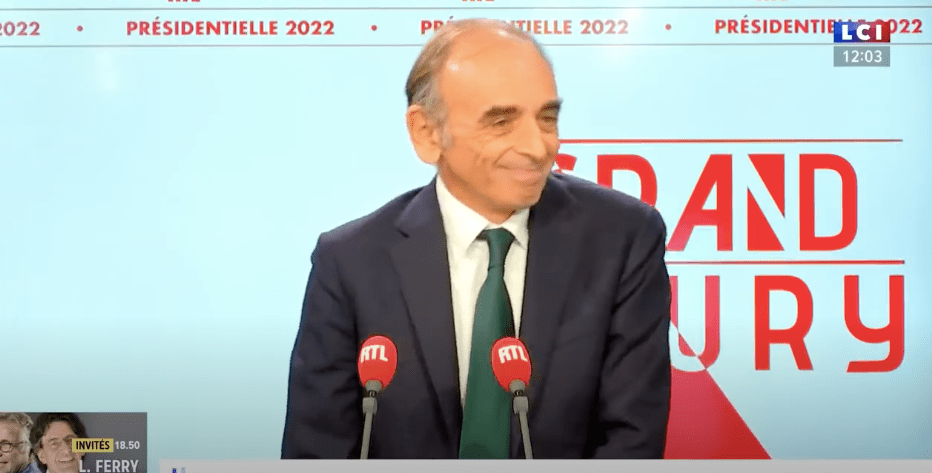 On the 24th October 2021, Zemmour appeared as a guest on Le Grand Jury in an interview filled with tendentious statements. Amongst these assertions were his suggestion to deport the 25% of foreigners in French prisons, “en forçant” their countries of origin to take them back, withdrawing benefits from foreigners (even if they are legal residents), as well as reiterating his opposition to wearing religious symbols in public, claiming that “À Rome fais comme les Romains”. As a speaker, we can see how he has gained so much interest in so little time. He demands attention, speaking over the journalists as they try to probe him, and even holding his hand up to silence them. When told that Marine Le Pen had claimed he cannot win the election as “[il méprise] une grande catégorie de Français”, Zemmour smirked and laughed to himself, before saying “Je vois pas où il y a seulement un mot, une phrase qui prouve que je méprise une partie des français. D’ailleurs, le mépris n’est pas dans mon caractère”. Here, he attempts to make a mockery of his biggest right-wing competitor, dismissing Le Pen’s allegations and presenting himself as the more credible candidate.