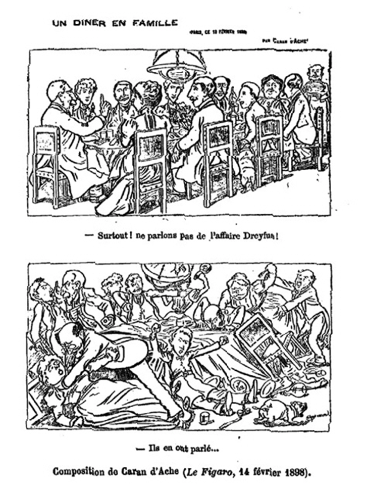 This illustration by Caran d’Ache (Figure 1) comes from the 14 February 1898 publication of Le Figaro, a month after Zola published his famous letter ‘J’accuse…!’ accusing the army of conspiring to wrongly convict Captain Dreyfus (Rimoch 2008, p.23). This started ‘l’affaire Zola;’ while Dreyfus’ trial was still at the core of the affair, the real matter became about whether you were for or against Zola, for order or for justice, for France or for Revolution (Boussel, 1960, p.172).