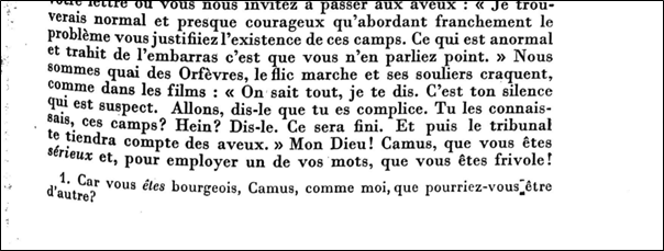 Sartre uses footnotes to reiterate his ideas (Fig. 4), belligerently reminding Camus that he can no longer rely on his Algerian origins to legitimise his role as a spokesperson for the oppressed. The separation of footnote from text creates another focal point, drawing the gaze down the page. This journalistic affordance, transgressing the border between letter and article, allows Sartre to taunt Camus on all parts of the page and corners Camus: he cannot escape Sartre’s attempts to discredit him as an ‘intellectuel engagé’.