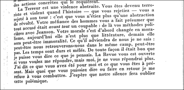 Sartre references Camus’s preceding letter multiple times throughout his twenty-page response and justifies his reaction as a consequence of Camus’s ‘ton si déplaisant’, necessitating his reply. The intertextuality is particularly effective since the letters are placed consecutively in the same volume, making it even more engaging for the contemporary reader who could flick back and forth to find the quotations that Sartre manipulates and uses against Camus.